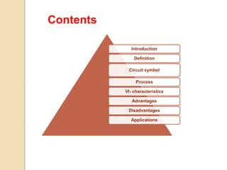 A tunnel diode, also known as an Esaki diode, is a semiconductor device that uses quantum tunneling for fast operation, originally invented by Leo Esaki in 1958. It features a p-n junction with heavy doping, exhibiting negative resistance where increased voltage leads to decreased current. Tunnel diodes offer advantages such as high speed, low cost, and low power dissipation, but have drawbacks like low output voltage swing and lack of isolation between input and output, with applications in high-speed switching and microwave oscillators.