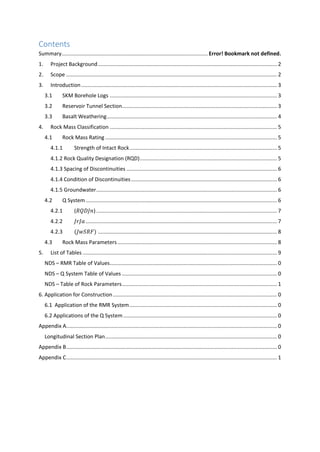 The document discusses a proposed 700m sewage tunnel connecting the Reservoir and Fawkner areas of Melbourne to the Northern Diversion Sewer. It analyzes borehole logs from the area to characterize the basalt rock mass where the tunnel will be constructed. Classification systems like the Rock Mass Rating and Q System are used to evaluate parameters like rock strength, discontinuity spacing and condition, and groundwater, in order to assess the rock mass and inform construction recommendations.