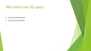 This document discusses various techniques for analyzing and tuning SQL queries to improve performance. It covers measurement methods like EXPLAIN and slow logs, database design optimizations like normalization and index usage, optimizing WHERE conditions to use indexes, choosing the best access methods, and join optimization techniques. Specific strategies mentioned include changing WHERE conditions to utilize indexes more efficiently, using STRAIGHT_JOIN to control join order, and optimizing queries that use filesort or joins vs subqueries.