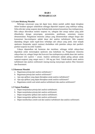 Dokumen tersebut membahas tentang prinsip analisis turbidimetri dan nefelometri. Analisis turbidimetri didasarkan pada pengukuran intensitas cahaya yang diteruskan melalui larutan yang mengandung partikel terdispersi, sedangkan analisis nefelometri didasarkan pada pengukuran intensitas cahaya yang disebarkan. Kedua teknik ini dapat digunakan untuk menentukan konsentrasi zat dalam larutan dengan menganalisis interaksi cahaya