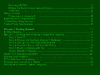 This document provides an overview and introduction to the Turbo C integrated development environment. It describes what is included in the Turbo C package, the system requirements, and new features of version 2.0. It also summarizes the contents and purpose of the two manuals included: Volume I covers using Turbo C for beginners, while Volume II is a reference guide for experienced C programmers.