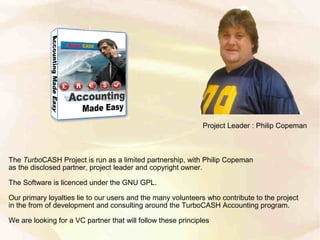 This document provides an overview of the TurboCASH accounting software project which is run as a limited partnership. It is seeking a VC partner and follows open source principles. Some key points made are that small businesses hate traditional accounting software as it is too expensive, difficult to use, requires support, and can't integrate with the web. TurboCASH is free to download, has great documentation, and a community supported website. It has been successful with over 500,000 downloads across 80 countries. Marketing is done through search engines, branding, and free distribution.
