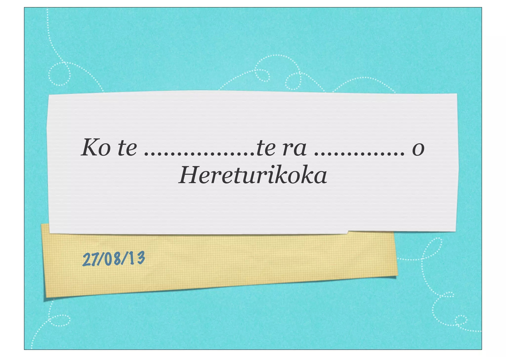This document contains a daily lesson plan for teaching Te Reo Maori, including the Māori language. It provides phrases to ask how someone is feeling and respond, such as "He aha te mate?" meaning "What's the matter?". Songs and activities are outlined, including asking "Ko wai au?" meaning "Who am I?". House points from attendance and other activities are listed for different groups. The document concludes with "Kua mutu" and "Ka kite", meaning "It is finished" and "Goodbye".