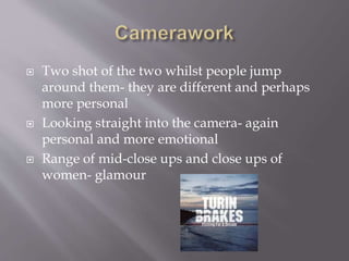 The document analyzes a music video, noting that it features close-ups of women to emphasize glamour, as well as shots of people jumping around two subjects set to an acoustic, melodic song that contrasts with the chaotic scenes and creates a personal atmosphere. It also discusses the use of regular cuts, cross-cutting between male and female characters to emphasize contrasts in appearance, and elements like flashing cameras that suggest glamour.