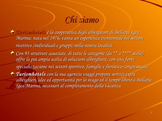 Turismhotels è una cooperativa di albergatori a Bellaria Igea Marina, attiva dal 1976, con 93 strutture associate che offrono varie soluzioni ricettive e servizi per il tempo libero. La località è caratterizzata da una spiaggia attrezzata, numerose opportunità sportive e culturali, e una posizione strategica vicino a città d'arte come Rimini e Ravenna. Inoltre, la zona è rinomata per la sua qualità gastronomica e l'ospitalità locale.