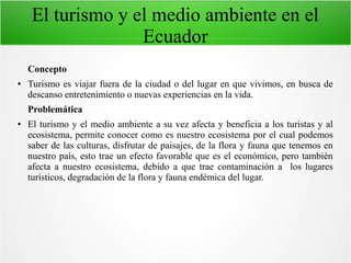 El documento habla sobre el turismo y el medio ambiente en Ecuador. Explica que el turismo beneficia la economía del país pero también afecta el ecosistema debido a la contaminación y degradación que causa en los lugares turísticos. Propone soluciones como mantener las áreas limpias, dar charlas de concientización y guiar a los turistas para evitar daños a la flora y fauna locales.