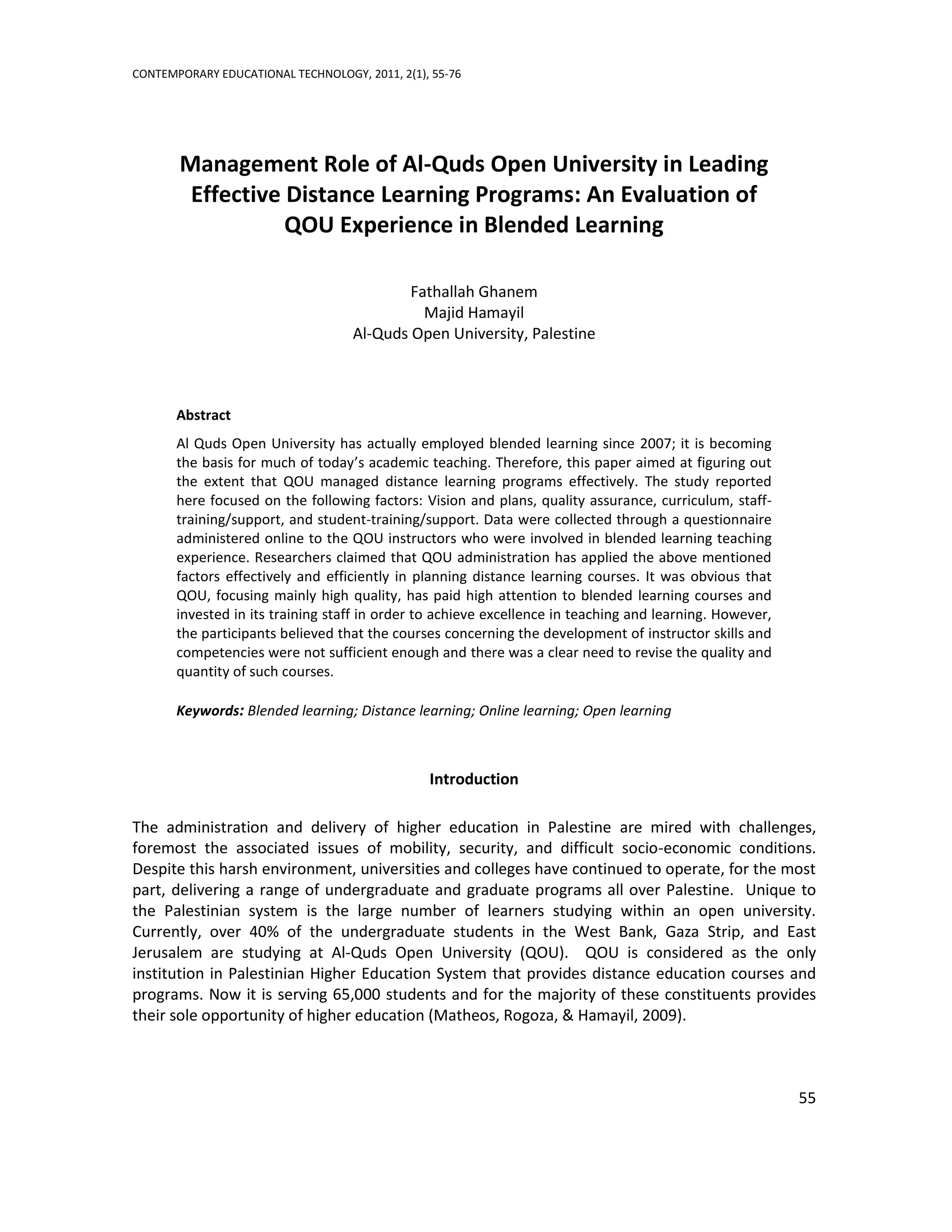 This document evaluates Al-Quds Open University's (QOU) management of effective distance learning programs through blended learning. It finds that QOU has generally applied factors like vision/planning, quality assurance, curriculum development, staff training/support, and student training/support effectively. However, participants felt instructor skill/competency courses could be improved. The document provides background on QOU's establishment, blended learning approach which combines online and in-person learning, and systems used like the academic portal, Avicenna virtual campus, and multimedia content production. It outlines the role of the Open Distance Learning Center in achieving goals like training over 1,600 staff and developing 128 blended courses.