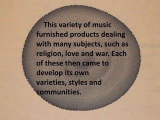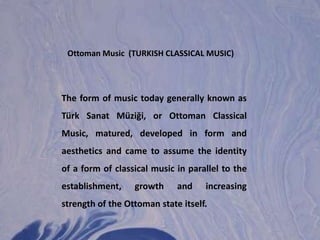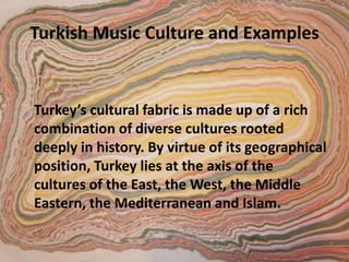 This document provides an overview of traditional Turkish music and decorative arts. It discusses the rich cultural history and diversity across Anatolia. Specific musical instruments are described like the ney flute and styles like Ottoman classical music. The art of marbling paper is also summarized, outlining the traditional techniques and materials used to create colorful designs on paper. Key historical masters of marbling are mentioned.