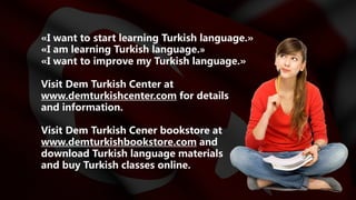 Dem Turkish Center is a resource for learning the Turkish language, offering both materials for self-study, including downloadable books and worksheets, and online classes via Skype. The materials include digital products in various formats such as PDFs, MP3s, and eBooks, while the courses cover speaking, grammar, reading, and writing skills. For more information, visit www.demturkishcenter.com and www.demturkishbookstore.com.