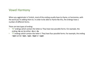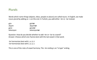 Vowel harmony is a rule in Turkish where suffixes added to words must match or "harmonize" with the last vowel sound of the word. There are two types of suffixes - "e-type" endings containing e and "i-type" endings containing i, each with multiple forms. When making nouns plural, suffixes of -ler or -lar are added depending on whether the last vowel is i, e, ö, ü or ı, e, o, u to follow the vowel harmony rule. Additionally, Turkish sometimes uses plural forms where English uses singular and vice versa, influenced by whether a number precedes the noun.