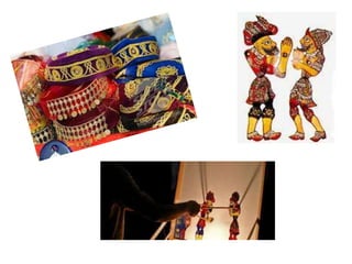 Turkey is located in both Eastern Europe and Western Asia, bordered by several countries. The official language is Turkish, which is related to languages spoken in Asia. Turks have a long tradition of art music similar to neighboring Islamic regions. One form of Turkish puppetry involves shows portraying a poor Greek man and his family during Ottoman rule, through which viewers can learn about Turkish customs. The puppets have two-dimensional profiles, made of camel skin joined at the torso and legs with pins, depicting characters in knee-high shorts and wool slippers.