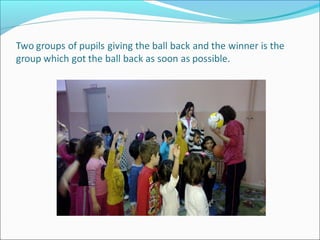Games and sports can help children develop physically and mentally. They learn skills like cooperation, sharing, and following rules by participating in traditional games like catching the handkerchief. This outdoor game involves two groups of 7-13 year olds competing to catch and return a handkerchief to their line without being tagged by the opposing player, with the group having more remaining players at the end declared the winner. Speed, intelligence and teamwork are key to succeeding in this longstanding game from Anatolia.
