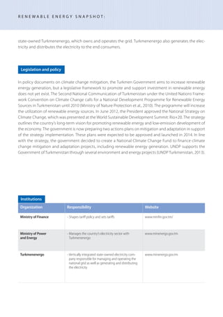 Turkmenistan has potential for solar power due to its dry desert climate, especially in western regions. It has the world's fourth largest proven natural gas reserves, which currently provide almost all its power. Renewable energy makes up only 0.18% of capacity due to reliance on subsidized natural gas. The government aims to increase renewable energy in policy documents but lacks a legislative framework to promote investment. UNDP is supporting renewable energy projects in Turkmenistan.
