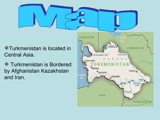 Turkmenistan is located in Central Asia and is bordered by Afghanistan, Kazakhstan, and Iran. The Turkmenistan flag features five carpets representing the main tribes and green fields. Turkmenistan was once part of the ancient Persian Empire and has artifacts dating back 8,000 years. The culture is unique from other Asian countries and features traditional attire like sheepskin hats. The population is over 5 million people with the capital Ashgabat and main languages being Turkmen and Russian. The climate is continental with warm summers and mild winters.