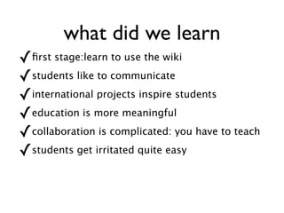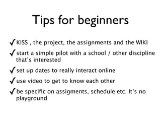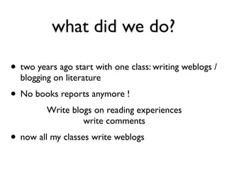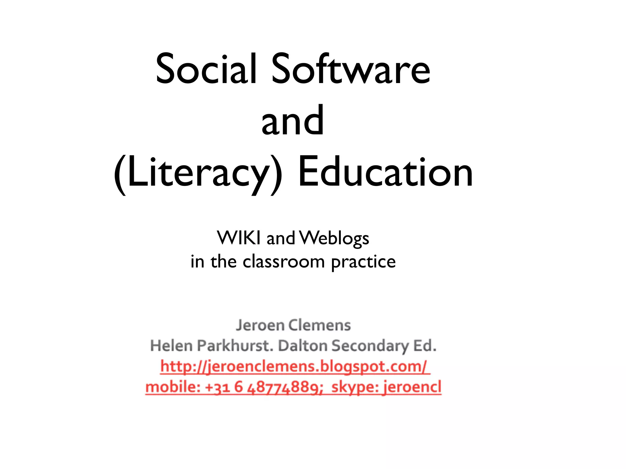 The document discusses the use of online social software, specifically wikis and weblogs, in educational settings to enhance literacy and collaborative learning. It highlights how students can benefit from reflective and interactive learning by sharing their reading experiences and collaborating on interdisciplinary projects. The author shares practical tips for educators to implement these tools effectively and inspire students in their reading and learning processes.