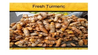 This document provides information on turmeric powder processing. It discusses that turmeric is native to tropical South Asia, especially India, which produces over 67% of the world's turmeric. The major turmeric producing states in India are Andhra Pradesh, Tamil Nadu, and Odisha. It also lists the major exporters and importers of turmeric globally. The document then outlines the process of curing, drying, polishing, and packing turmeric powder. It presents a sample business plan for a turmeric powder processing project in India, including projected costs, means of financing, capacity, sales price, and profit analysis.