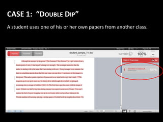 This document outlines 3 cases of plagiarism and warns plagiarists. Case 1 is reusing one's own work from another class. Case 2 is passing off another student's work as your own. Case 3 is assembling a paper from various internet sources without proper citation. The document advises plagiarists to beware of consequences for academic dishonesty.