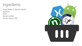 The document outlines a testing framework for presentations, focusing on audience reactions based on session quality. It includes structured scenarios for testing responses using Given-When-Then methodology, emphasizing acceptance-driven presentation testing. Additionally, it references various testing types and proposed tools for mobile apps and UI testing.