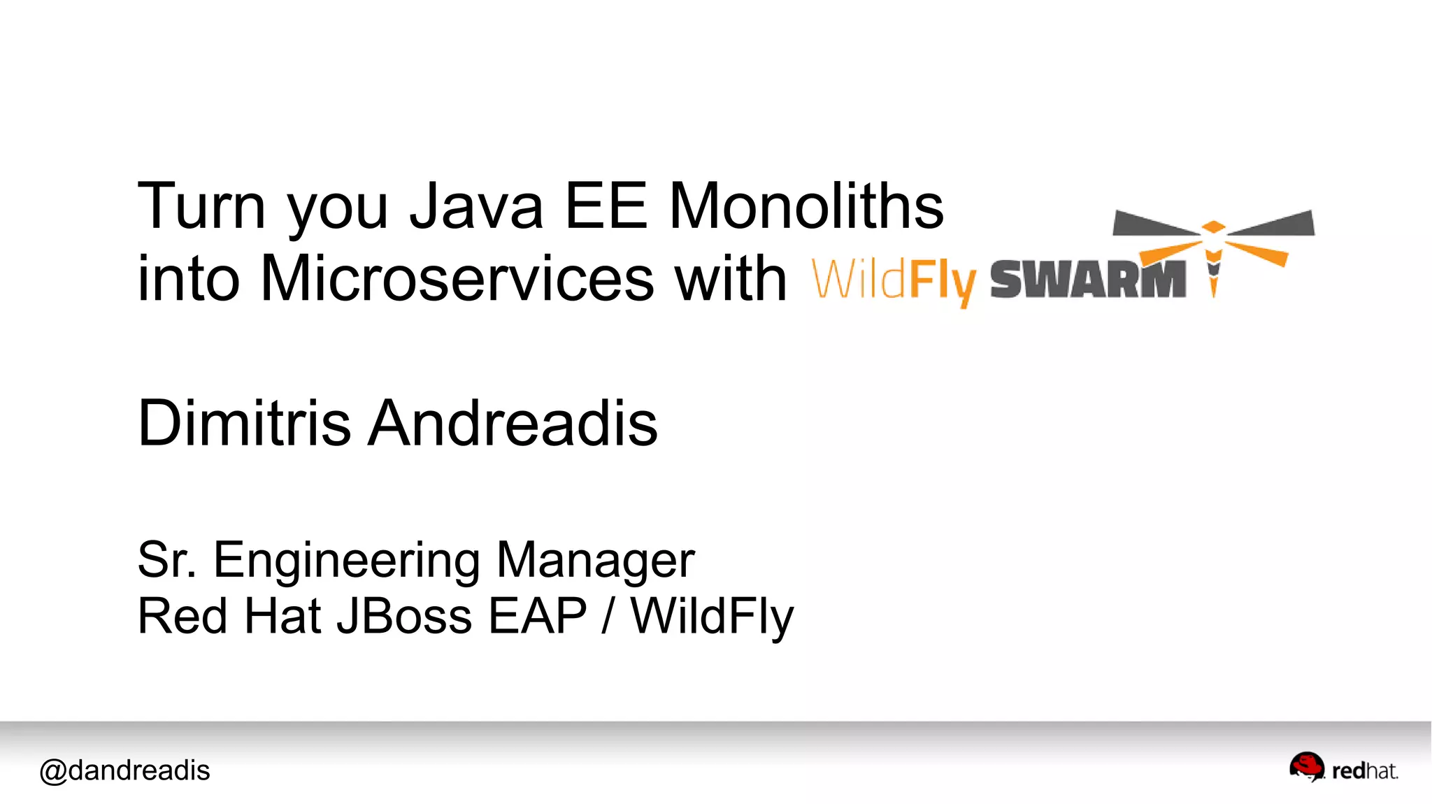 This document provides an overview and introduction to WildFly Swarm, which allows developers to decompose a WildFly application server into smaller components called "fractions" to right-size the runtime for microservices. It discusses concepts like fractions, how to get started with a basic WildFly Swarm application, and advanced configuration options. The presentation encourages leveraging existing Java EE expertise while building on mature technologies to develop microservices.