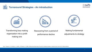 The document discusses the turnaround strategy for Alok Industries, a vulnerable textile organization in India. It provides an overview of Alok's history and products. In recent years, Alok faced performance decline due to external factors like changing economic conditions and internal issues like management failure. To recover, Alok implemented various generic turnaround strategies like cost reduction, asset redeployment, and selective changes to product and market strategy. It also analyzed Alok's lifecycle and the strategies used during different stages, from growth to maturity and transformation, to achieve turnaround. These included developing new products, improving production efficiency, and adapting to increased demand during the COVID-19 pandemic.