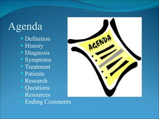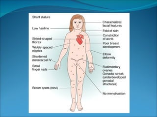 Turner syndrome is a genetic condition that affects development in girls caused by a missing or partial X chromosome. It was first described in 1938 by Dr. Henry Turner. Common characteristics include short stature, ovarian dysfunction leading to infertility, and heart defects. Diagnosis involves chromosome analysis from amniocentesis or blood tests. Treatment may include growth hormone, estrogen therapy, and assisted reproduction. Research continues on treatments and managing associated health problems throughout life.