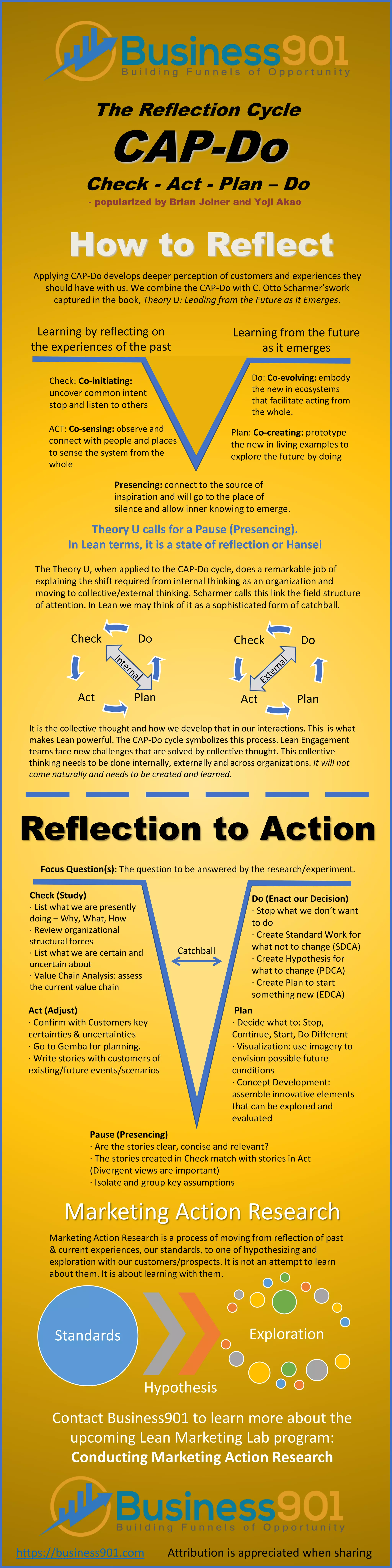The document discusses the CAP-DO reflection cycle, emphasizing the integration of Brian Joiner and Yoji Akao's model with Otto Scharmer's Theory U to enhance collective thinking in organizations. It outlines the stages of the cycle: co-evolving, co-initiating, co-sensing, co-creating, and presencing, which facilitate deeper customer engagement and organizational learning. Additionally, it highlights the importance of collective thought and learning from experiences as essential components of effective lean engagement and marketing action research.