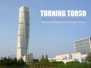 The Turning Torso in Malmo, Sweden is a residential tower that twists 90 degrees from bottom to top. It has a central concrete core and cantilevered floor slabs that are supported by an exterior steel spine. The steel spine transfers wind and seismic loads to the core. The tower was constructed using an automatic climbing formwork that moved up with each completed floor. The complex twisting geometry required a double curved glass and aluminum facade with windows that lean up to 7 degrees to accommodate the building's twist.