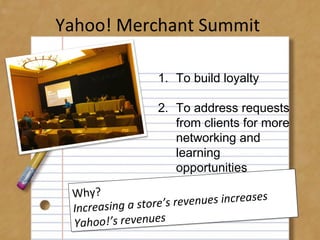 This document discusses strategies for turning customers into fans through community events. It provides examples of successful community events held by Yahoo! Developer Network, Yahoo! Merchant Summit, and Flickr. Key metrics for measuring success are mentioned like survey results, attendance numbers, and social media engagement. Lessons learned include partnering with relevant conferences and sponsors, designating regional community managers, and creating a process for supporting member-created events.