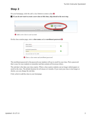 This document provides instructions for instructors to get started using the Turnitin plagiarism detection service. It outlines an 8 step process for instructors to: 1) create a user profile and register with Turnitin, 2) create a class and distribute the enrollment information to students, 3) create assignments for students to submit papers, 4) submit papers to assignments for plagiarism checking, 5) view originality reports which highlight matching text from other sources, 6) exclude sources from the originality report, and 7) use the GradeMark feature to provide feedback on student papers.