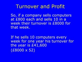 Turnover is calculated by multiplying the sales price of a product by the number of units sold. For example, if a company sells 10 computers per week at £800 each, their weekly turnover is £8,000. Their annual turnover would be £8,000 x 52 weeks, which is £41,600. Profit is calculated by taking a company's turnover and subtracting all costs from it. Higher profits allow companies to expand more easily. Companies that make consistent losses will eventually go out of business.