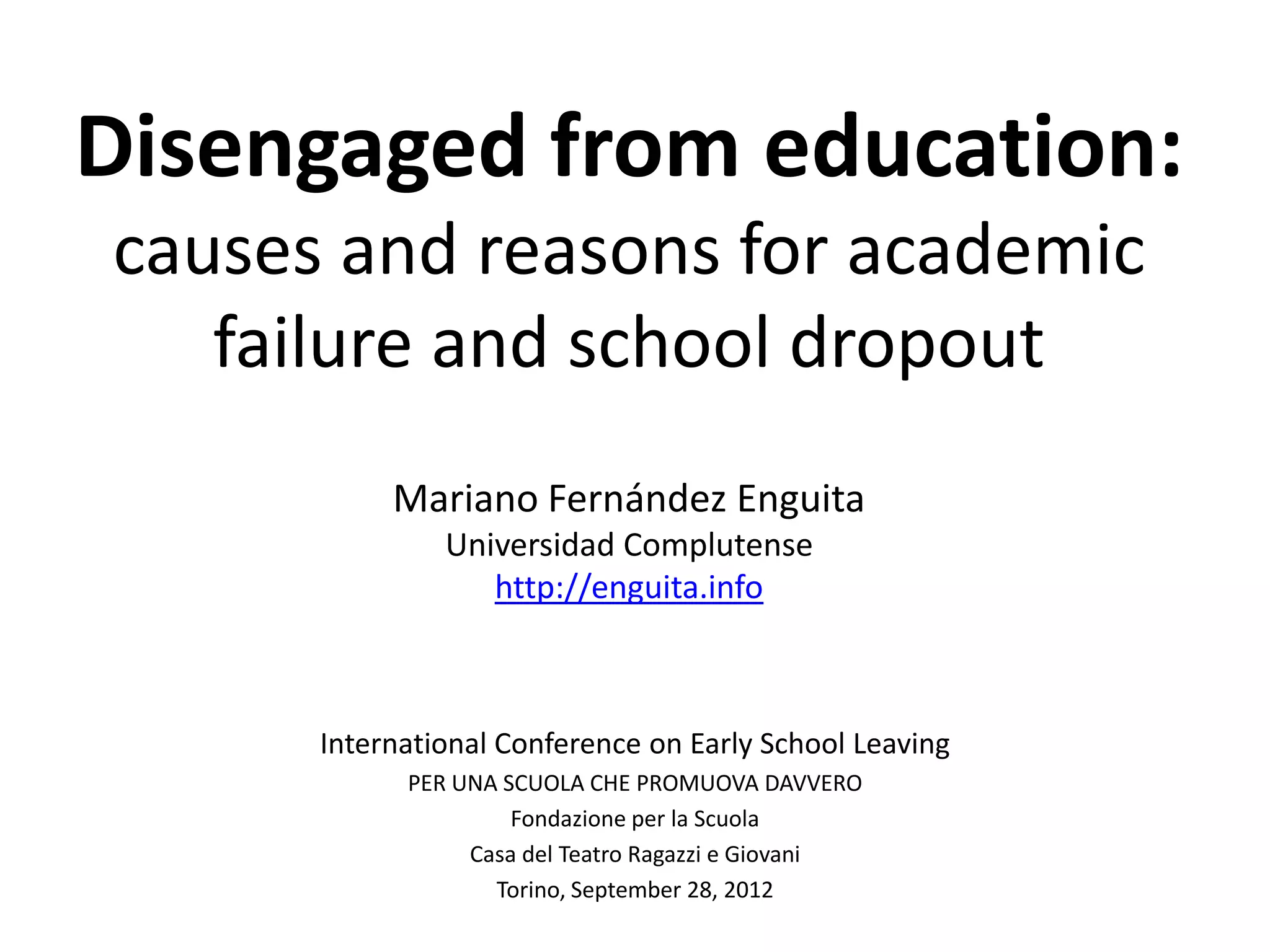 Mariano Fernández Enguita presented at a conference on early school leaving. He discussed how universal primary education was once a success but secondary education is facing failures in academic achievement and early leaving. The rise of information and learning societies has led to knowledge becoming more valuable and unequal. Schooling may need to be enhanced to better serve diverse students as learning occurs increasingly outside of schools through new technologies and open resources. Enguita questions whether current schooling models will remain relevant in the future.