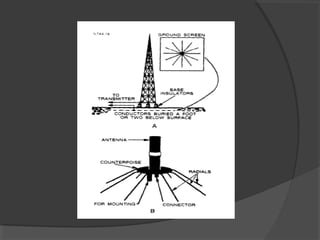 A turnstile antenna consists of two dipole antennas oriented at right angles and fed 90 degrees out of phase, producing an omnidirectional radiation pattern. It has 3dB lower gain than a single dipole but provides coverage in all directions without needing to rotate. Turnstile antennas are commonly used for FM radio reception. A Marconi antenna is a grounded monopole antenna used at frequencies below 2MHz that requires a grounding path. When near the ground, the earth acts as a reflector influencing the radiation pattern. A counterpoise is used to improve ground effects for antennas over poor conducting soil. A ground plane antenna is a variant of a dipole fed with coaxial cable using radials instead of a hollow inner