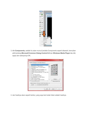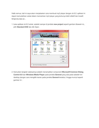 Dokumen ini menjelaskan cara membuat aplikasi pemutar MP3 menggunakan Visual Basic 6.0, termasuk langkah-langkah untuk menambahkan komponen dan menulis kode yang diperlukan. Selain itu, juga dijelaskan cara menampilkan tanggal dan waktu pada form menggunakan timer dan label. Panduan ini memberikan langkah-langkah yang jelas untuk menyelesaikan proyek tersebut dengan sukses.