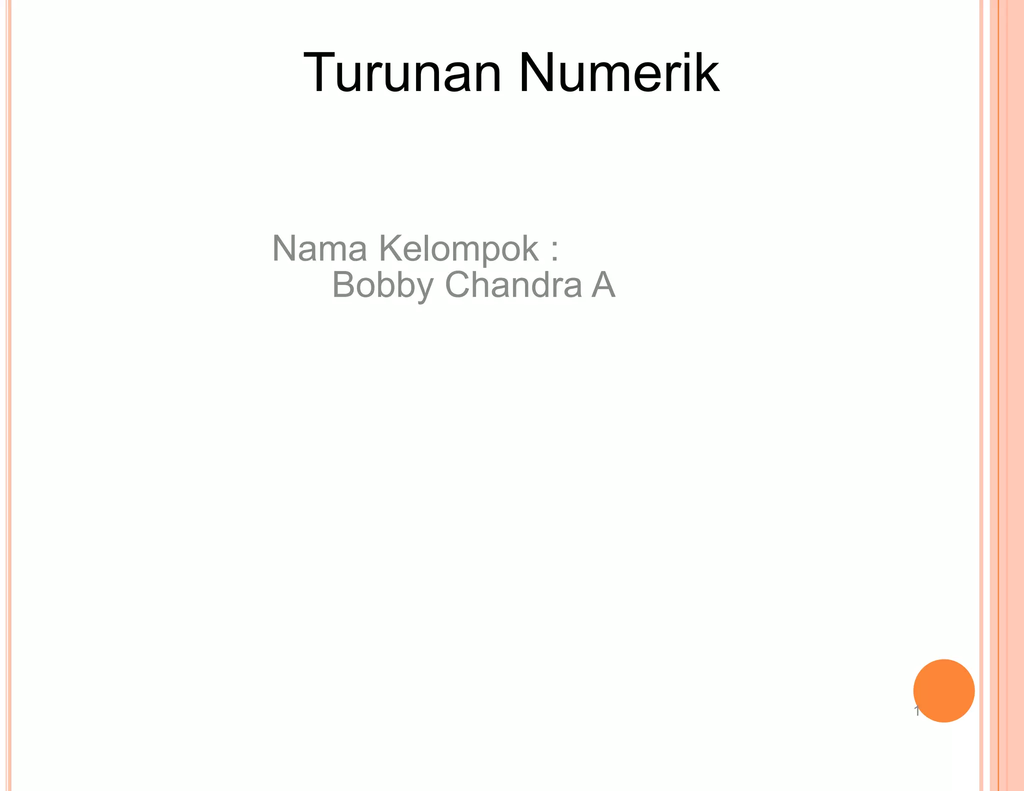 Dokumen ini membahas turunan numerik, termasuk definisi, pendekatan untuk menghitung turunan (selisih maju, mundur, dan pusat), serta bagaimana merumuskan turunan pertama dan kedua menggunakan deret Taylor dan polinom interpolasi. Beragam rumus disajikan untuk menghitung turunan dengan pendekatan yang berbeda, dicontohkan melalui analisis data tabel. Contoh konkret diberikan untuk menghitung nilai turunan pada titik tertentu dengan berbagai orde akurasi.