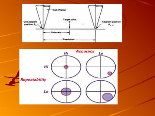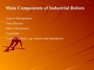 Industrial robots are programmable manipulators designed to move materials and tools. They consist of an arm, end effectors, drive mechanism, controller, and optional sensors. Robots have various types of joints that allow rotational, radial, and vertical movement. Common configurations include Cartesian, cylindrical, polar, and joint-arm designs. Robots are also classified based on their control system as either point-to-point or continuous-path robots.