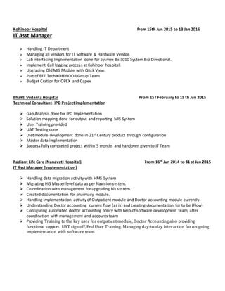 Tushar Sonawane is an IT Assistant Manager with over 9 years of experience in healthcare IT implementation and support. He has expertise in healthcare systems like Hospital Information Systems, Electronic Medical Records, and Revenue Cycle Management. Some of his skills include requirement gathering, software specification documentation, product implementation, release management, support, and SQL expertise. He is looking to leverage his experience in areas like system implementation, user training, vendor management, and support.