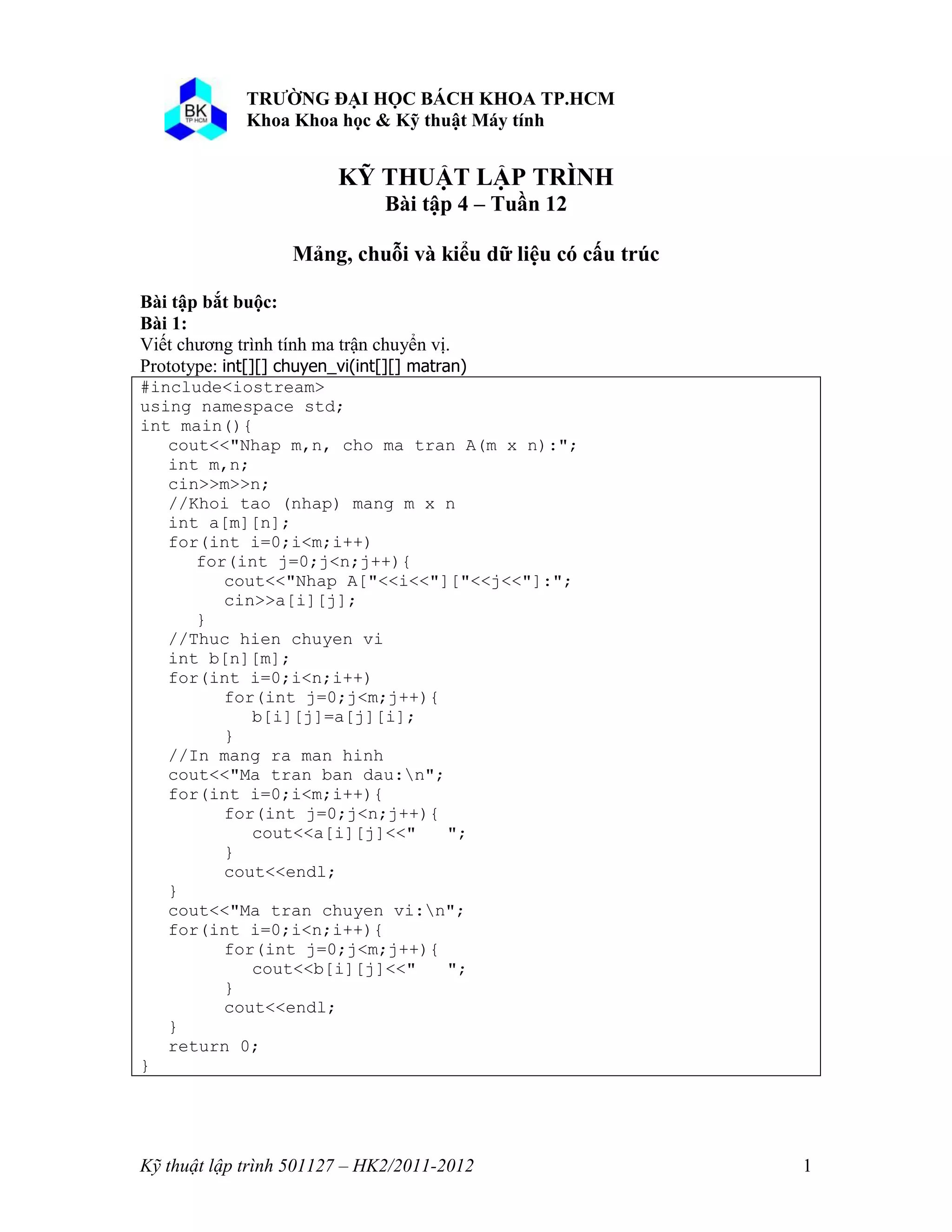 Tài liệu trình bày 14 bài tập lập trình thực hành trong C++, bao gồm các chủ đề như tính toán ma trận, xử lý chuỗi, và quản lý dữ liệu thời tiết. Mỗi bài tập có hướng dẫn cụ thể và mã nguồn mẫu để người học tham khảo. Tài liệu cũng cung cấp các cấu trúc dữ liệu và phương pháp giải quyết bài toán liên quan đến xử lý dữ liệu và thuật toán.