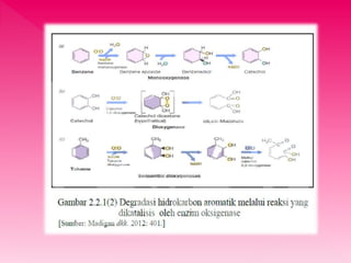Dokumen tersebut membahas tentang degradasi hidrokarbon oleh bakteri melalui proses bioremediasi, di mana bakteri dapat memecah hidrokarbon berbahaya menjadi senyawa yang tidak berbahaya seperti air dan karbon dioksida serta menggunakannya sebagai sumber karbon untuk pertumbuhan. Proses degradasi dapat berlangsung secara sempurna atau tidak sempurna tergantung jenis bakteri dan senyawa hidrokarbon yang d
