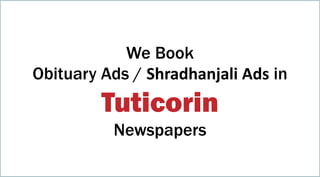 This document provides information about booking obituary and memorial ads in newspapers in Tuticorin, India. It lists the email and phone contact information for the company that has been in service for 11 years booking these types of ads. The document also mentions they will book ads in various newspapers and requests users to email their ad content to the provided email address.