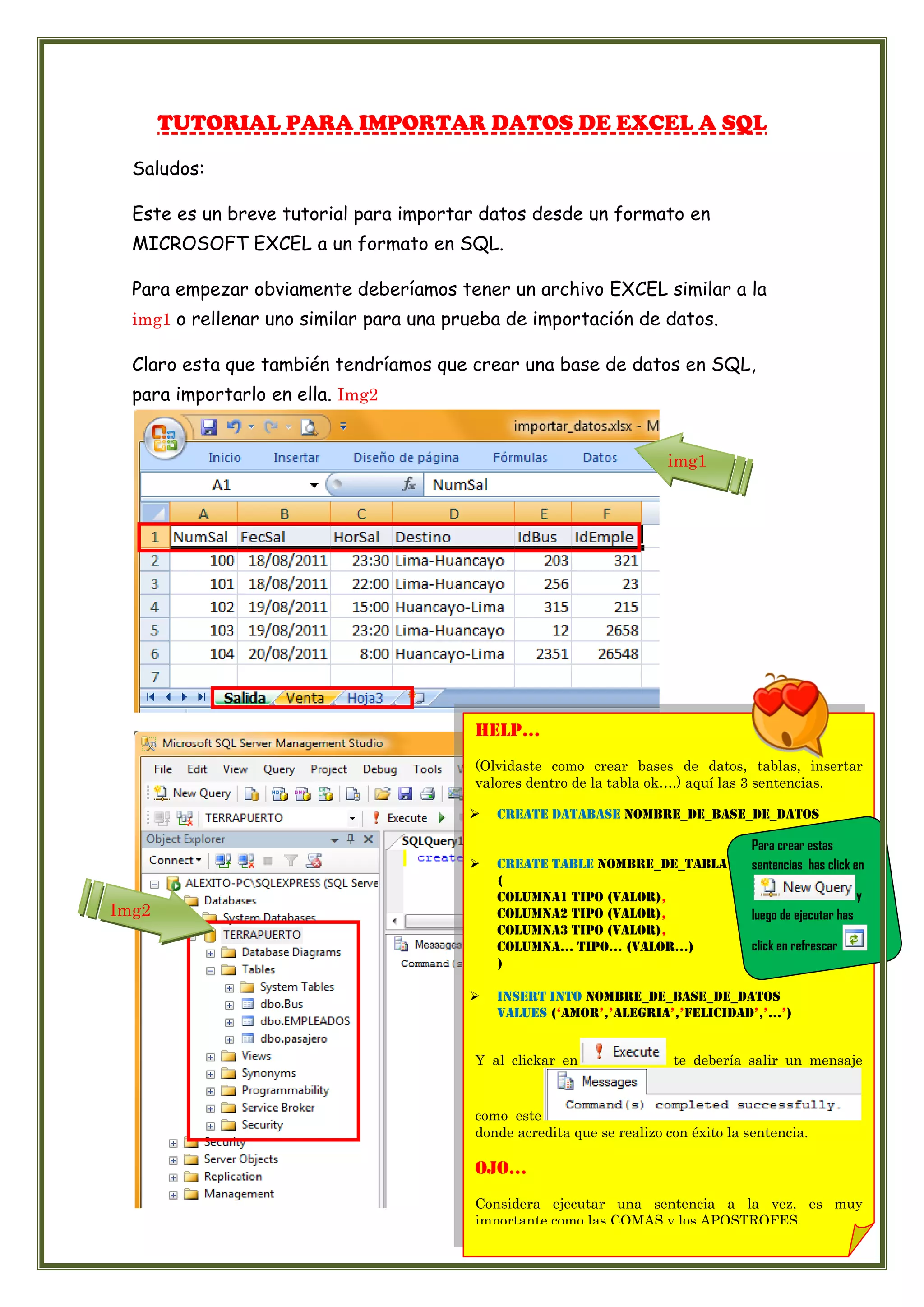 Este documento proporciona instrucciones para importar datos de Excel a una base de datos SQL. Primero, se debe crear una hoja de cálculo de Excel con los datos o usar un archivo de ejemplo. Luego, se crea una base de datos y tabla en SQL para almacenar los datos. Finalmente, se usa el asistente de importación de datos en SQL para mapear los datos de Excel a la tabla creada previamente.