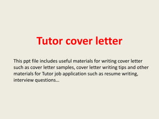 This document provides materials for writing a cover letter for a tutor position, including two sample cover letters, cover letter writing tips, and other job application resources such as resume samples and interview questions. The first sample cover letter emphasizes the applicant's experience and ability to help students achieve their goals. The second sample cover letter highlights the applicant's extensive tutoring experience in multiple subjects and ability to work with students of all ages. Useful free resources for writing an effective cover letter, resume, and preparing for an interview are also listed.