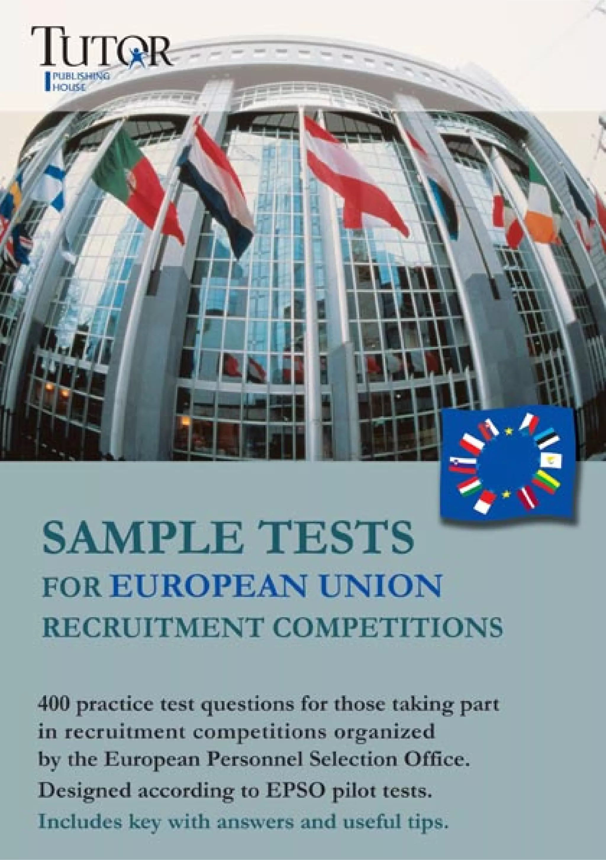The document provides sample tests for numerical reasoning, verbal reasoning, and European public administration that could be used for European Union recruitment competitions. It includes 4 tests of numerical reasoning with a total of 20 questions and sample answers. The tests cover topics such as statistics, percentages, profit margins, drug use, employment rates, housing, and more. Answers are provided after each test for verification.