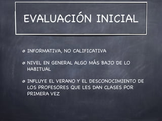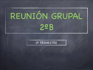 Este documento resume una reunión del grupo 2oB sobre la evaluación del primer trimestre. Se informa que el nivel general de los estudiantes es algo más bajo de lo habitual, posiblemente debido al verano y a los nuevos profesores. Se discuten los criterios de calificación para las asignaturas no bilingües y los temas más importantes de lengua y matemáticas para el curso. También se mencionan las tutorías, proyectos, y otros asuntos como la convivencia y la importancia de las familias.