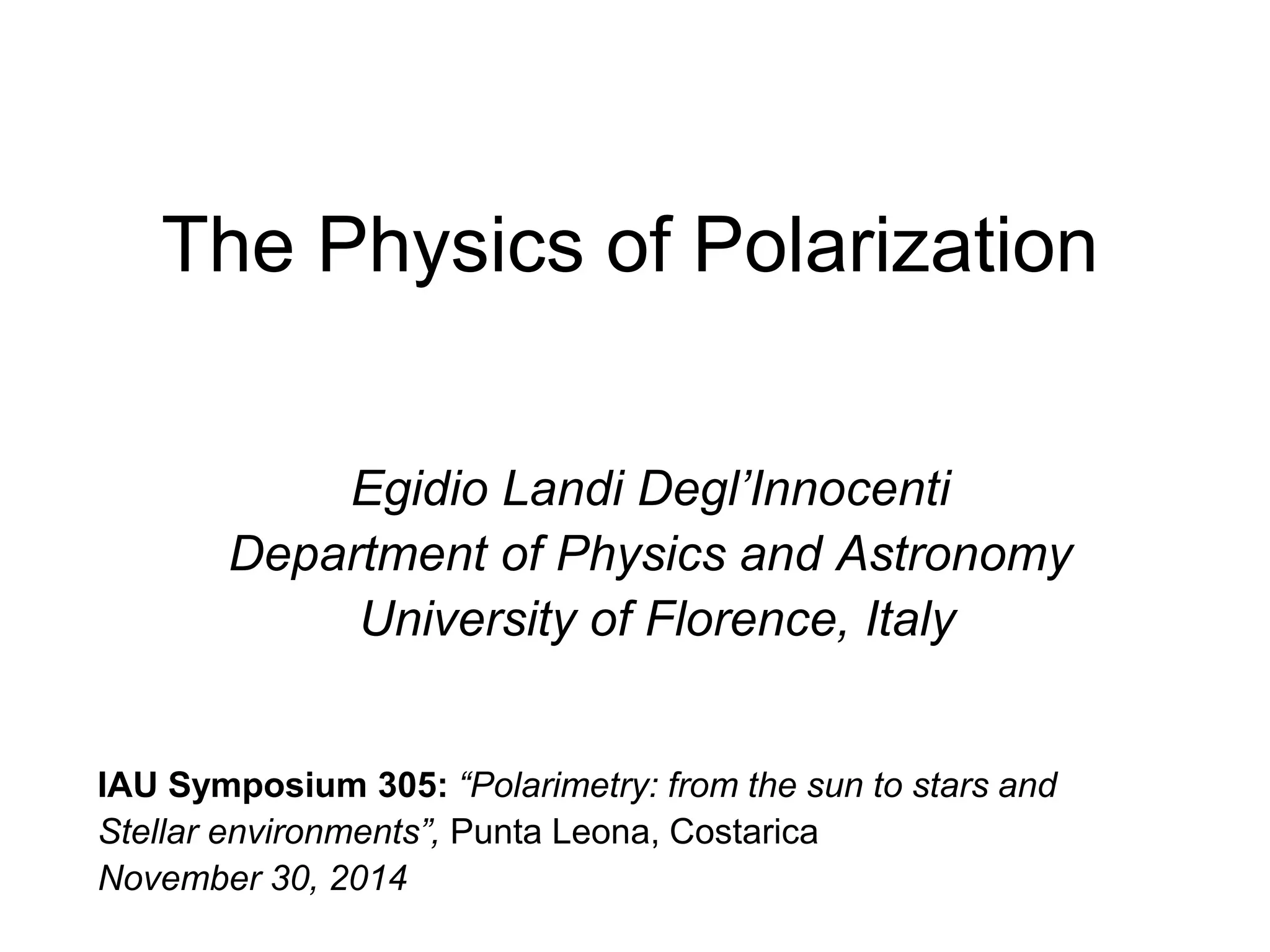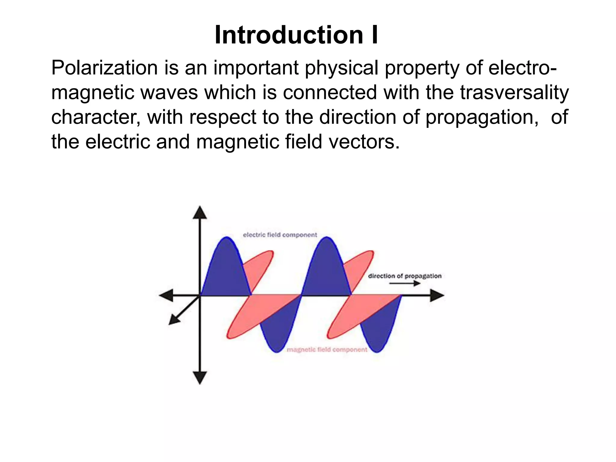 This document provides an overview of the history and physics of polarization. It discusses how early scientists like Bartholin, Huygens, and Newton began exploring the transverse properties of light. Later, Malus introduced the term "polarization" and demonstrated it as an intrinsic property of light. The document then covers descriptions of polarized light, polarization phenomena like reflection/refraction, and applications of polarization in areas like optics and everyday life.