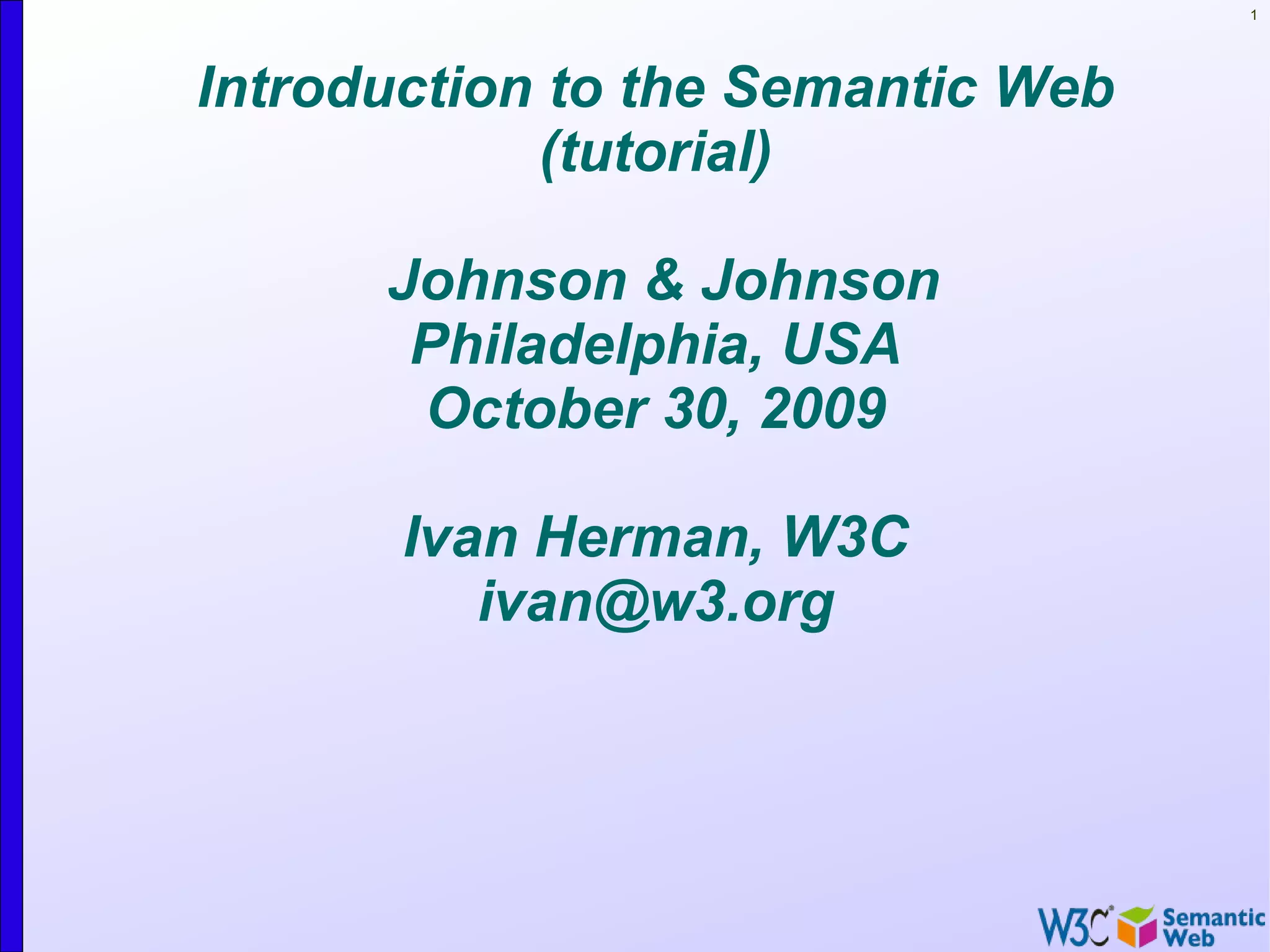 The document introduces the concept of the semantic web by providing examples of how data from different sources on the web can be combined and queried together. It describes mapping different datasets to an abstract data representation, merging the representations, and making new queries across the combined data. Adding extra information like defining authors as persons uniquely identified by name and homepage allows richer queries by linking datasets in new ways. The semantic web aims to make data on the web accessible and useful by combining it in a standardized, machine-readable format.