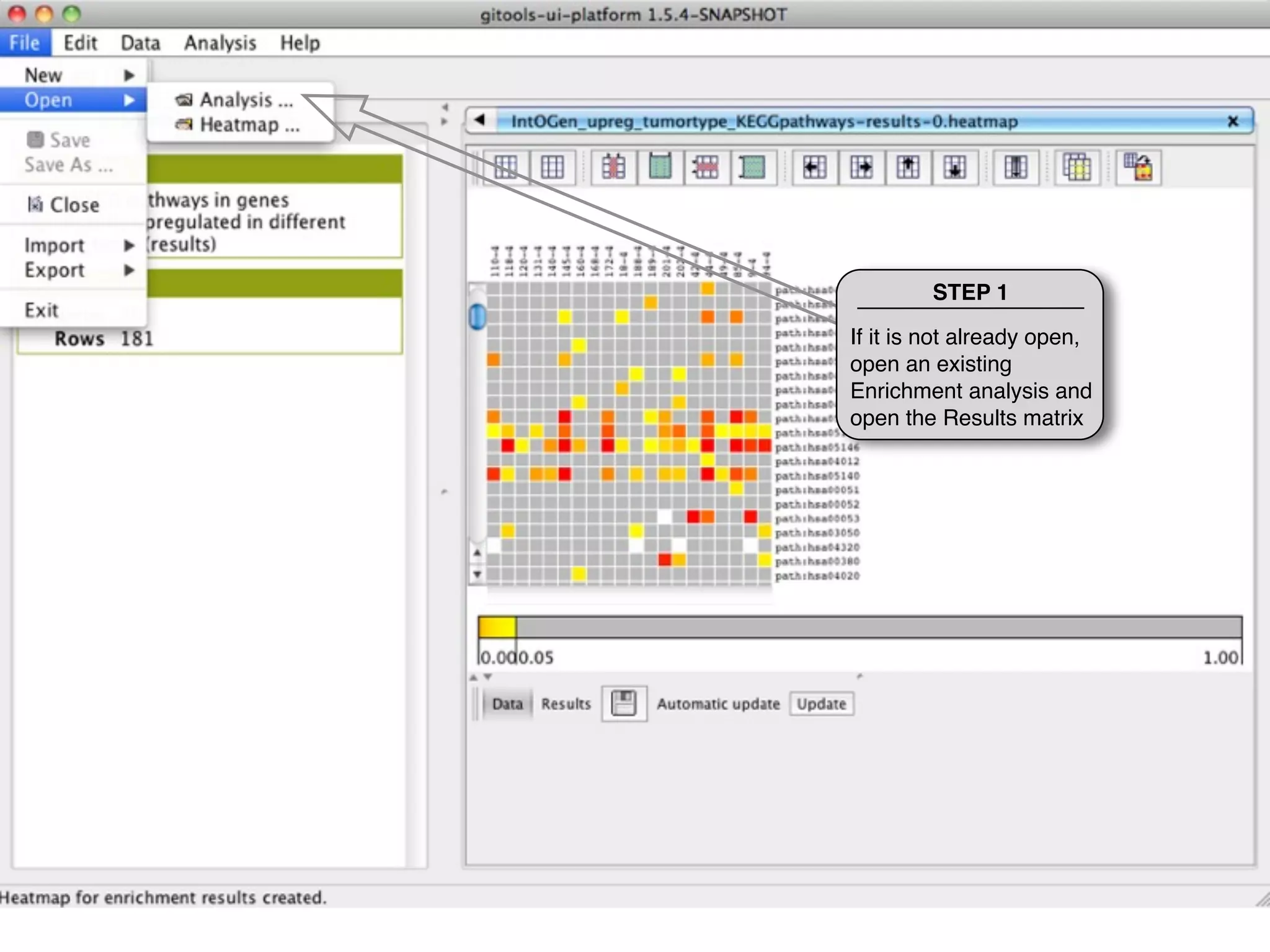 This document provides steps to explore and customize the results of an enrichment analysis in a heatmap visualization tool. It describes how to sort and filter rows and columns, change the labels to use more descriptive names instead of IDs, and modify the color scale to better represent p-value results. The goal is to interactively investigate and understand the relationships between enriched gene sets and conditions from the analysis.
