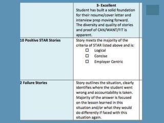 This document outlines the agenda and activities for a tutorial session on skills matrices and analyzing job postings. The session includes recapping one-on-one meetings, reviewing skills matrices using the STAR method, having students practice telling stories and receiving feedback, and assigning students to research and analyze a job posting in preparation for developing their skills matrices. Students are instructed to identify the skills, industry terms, qualities needed, and relate their experiences to the job posting for the assignment due the following week.