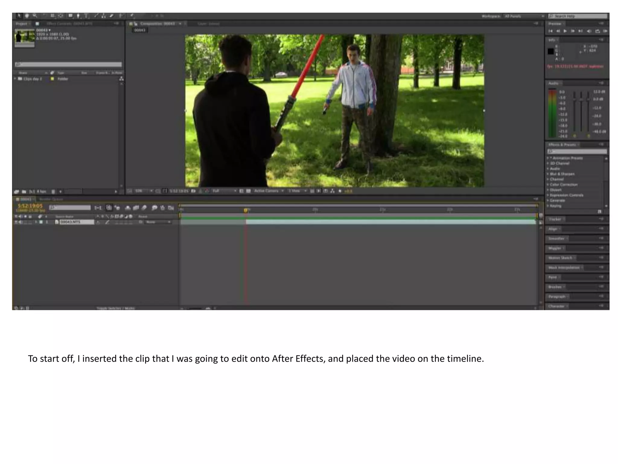 The document provides instructions for creating a lightsaber effect in After Effects. It describes inserting a video clip into the timeline, then creating a white solid above it to form the basic lightsaber shape. Keyframes are added by adjusting the solid's mask as it is positioned frame by frame along the clip. Additional solids are then copied and layered with increasing mask feather to give the lightsaber a glowing look. A black solid and color balancing are used to create a second lightsaber of a different color. Finally, a shine effect is added where the lightsabers meet to complete the illusion.