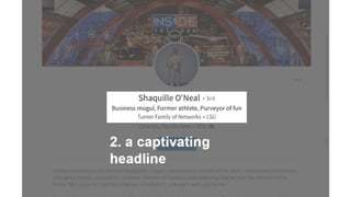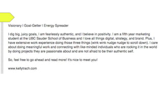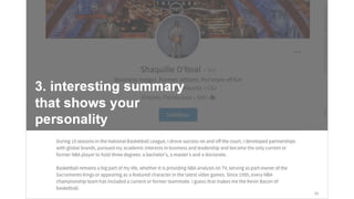 This document outlines a LinkedIn tutorial presentation. It includes an agenda that discusses leveraging LinkedIn and getting set up. The presentation covers using LinkedIn as a social network to build one's personal brand and network. It provides tips for an effective LinkedIn profile, including using a high-quality headshot, crafting headlines and summaries, and including experiences. The presentation advises managing expectations by noting LinkedIn is best for networking rather than direct job offers. It also offers guidance on connecting with professionals, recruiters, mentors and groups in one's industry. Students are assigned tasks to create a profile, connect with peers and get a headshot.