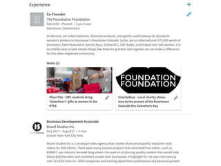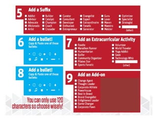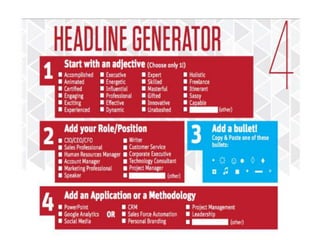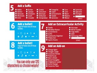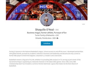 This document summarizes a LinkedIn tutorial that provides guidance on setting up and leveraging a LinkedIn profile. It includes an agenda for the tutorial covering creating a LinkedIn profile, networking on LinkedIn, and assigning work. The tutorial instructs students on the key components of a successful LinkedIn profile, including a professional headshot, engaging headline, interesting summary, and fully completed experiences. It emphasizes that LinkedIn is for professional networking and connections rather than job offers. Students are encouraged to connect with professionals, recruiters, mentors and complete assignments.